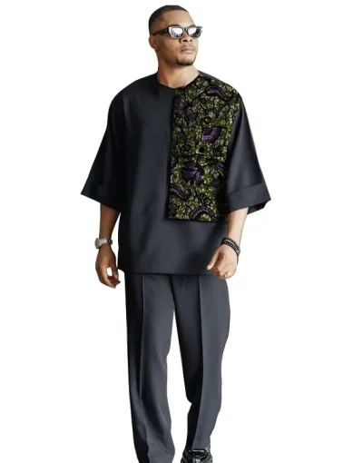 3/4 Sleeves African Clothes Black Men Loose Set Nigerian Style Patchwork Tops With Pant Tailor Made Party Outfit