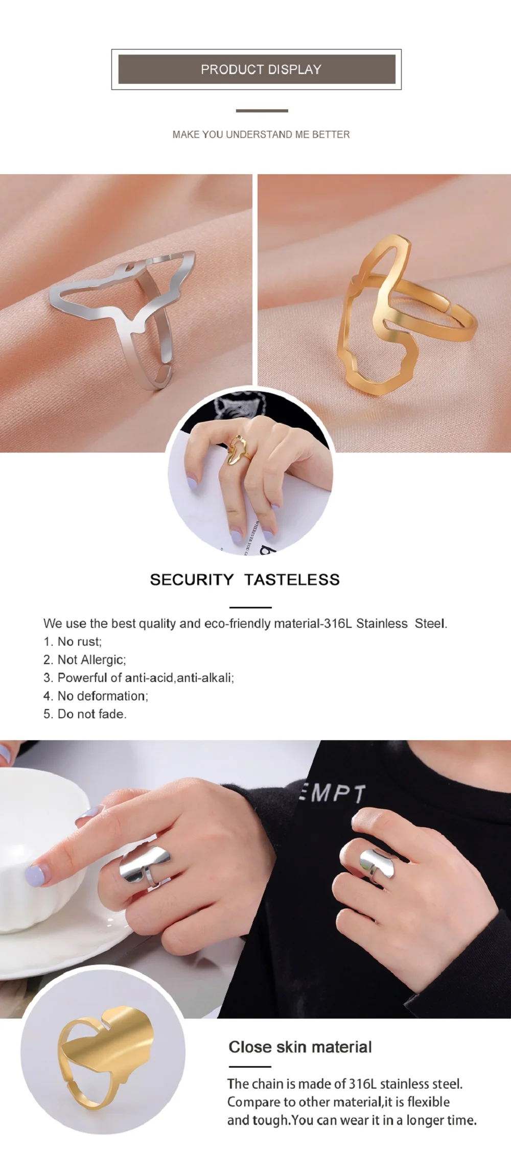 Specifications: Material: Stainless Steel Color: Silver, Gold Size: Adjustable Weight: 1.4g-2.6g Width: As the pictures Thickness: 1mm Features: **Elegant Design and Versatile Style** The My Shape African Map Ring is a testament to the fusion of fashion and cultural significance. This adjustable ring, available in both silver and gold colors, is crafted from high-quality stainless steel, ensuring durability and a long-lasting shine. Its geometric design, featuring the outline of the African continent, is a nod to the country in the middle of South Africa and the beautiful places of South Africa. This ring is not just a piece of jewelry; it's a statement of pride and a celebration of the partitioning of Africa. Whether you're traveling to South Africa or simply admiring its beauty from afar, this ring is a perfect accessory to showcase your love for the continent. **Perfect for Every Occasion** This fashionable ring is not limited to a single occasion; it's designed to complement any outfit, from casual to formal wear. Its adjustable nature makes it a versatile piece that can be worn by both women and men, making it a unisex accessory. The high polished finish adds a touch of elegance, making it suitable for parties, weddings, or simply as a daily accessory. The ring's lightweight design ensures comfort, allowing you to wear it throughout the day without any discomfort. **A Gift That Speaks Volumes** Looking for a thoughtful gift? The My Shape African Map Ring is an excellent choice. It's a fashionable piece that resonates with the spirit of travel, making it a perfect gift for someone who loves to explore or has a special connection to South Africa. The ring's adjustable feature ensures that it fits a wide range of finger sizes, making it a universally appealing gift. It's also a great conversation starter, allowing the wearer to share their love for the country and its rich history. With dropshipping available, this ring is a hassle-free option for gifting, making it a convenient choice for those looking to surprise someone special.
